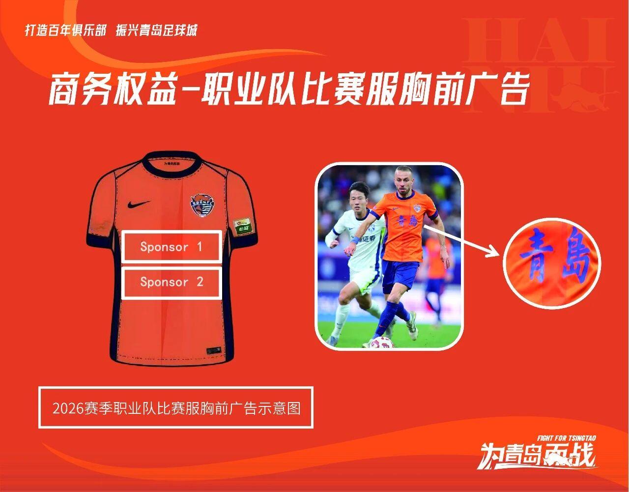 从青岛海牛招商手册发布的示例内容来看,他们还有进一步的招商计划。比如,球队冠名权还在积极推进招商中,如果有商家支持,青岛海牛将以“青岛海牛××××队”的名字,驰骋在2026赛季中超和足协杯赛场。又如,胸前和背后广告,俱乐部各预留了两处赞助商的商业展示区域。这也是一场比赛中,曝光率最高的两大黄金位置。另外,训练服以及赛前热身服,以及青训梯队服装,也设置有胸前和背后广告招商计划。